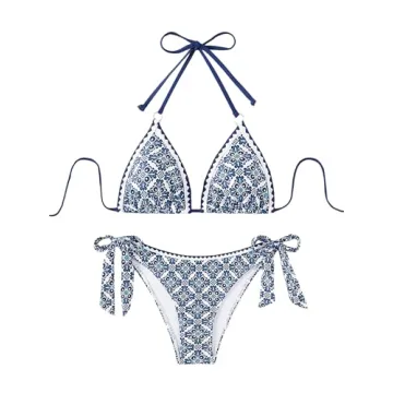 Show moreEmbrace the summer with the RoseSeek Women's Boho Halter High Waisted Bikini Sets, a perfect blend of style and comfort. Crafted from breathable, soft, and skin-friendly fabric with high stretch, this bikini ensures a comfortable fit for all-day wear. The 2-piece set features a high waist, halter neck, triangle top, backless design, knot and tie back, and tie side details, making it a trendy choice for any fashion-forward individual. The geometric, random print adds a unique touch to your beachwear collection, suitable for various occasions from tropical vacations to casual pool days.