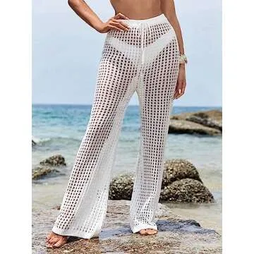 Show moreIntroducing the RoseSeek Women's Cover Up Beach Pants, the ultimate stylish addition to your summer wardrobe. Perfectly designed for those sunny beach days, these high-waisted pants feature a lovely hollow crochet pattern that offers elegance and comfort in equal measure. Made from 100% high-quality polyester, they are not only breathable but also provide a slight stretch, making them ideal for a range of body types while ensuring a comfortable fit throughout your day. With an easy-to-use drawstring elastic waist, these pants promise a customized fit that flatters your figure perfectly.