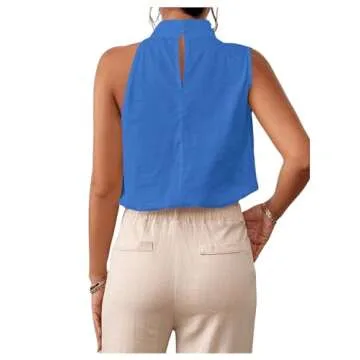 RoseSeek Women's High Neck Sleeveless Blouses Dressy Casual Crop Tops Work Business Blouse Shirt Tank Top Blue Small
