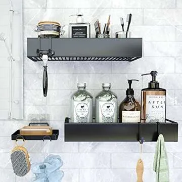 Roseyat Shower Caddy Shelf Organizer with Hooks, Adhesive Shower Storage Organizer Rack for Bathroom, Kitchen, No Drilling Wall Mounted Shampoo Holder Basket with Shower Soap Dish-3 Pack Black…