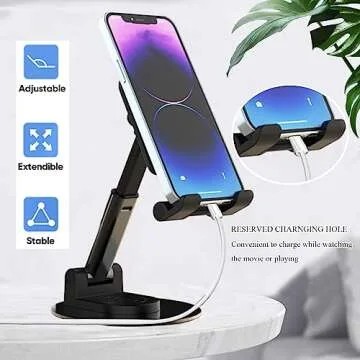 Show more Meet the Rotatable Cell Phone Stand for Desk, your new companion for seamless mobile use! Crafted for ultimate convenience, this ergonomically designed phone holder adjusts in height between 5.1 and 6.2 inches and provides an exceptional tilt angle ranging from 5 to 85 degrees. Whether you're browsing recipes in the kitchen, attending virtual meetings at your office, or catching up on your favorite shows at home, this adjustable stand reduces neck and back strain, making it a must-have accessory for anyone who spends time on their device. Suitable for smartphones ranging from 4 to 7 inches, this versatile stand supports various models including iPhone 14, Pro, Pro Max, and 12, as well as Samsung Galaxy devices, ensuring compatibility with your tech needs.