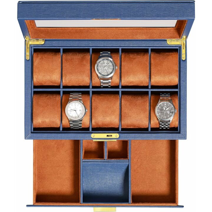 Show moreIntroducing the ROTHWELL 10-Slot Watch Box in Leather with Valet Drawer—a luxurious and elegant solution for organizing and displaying your finest timepieces. Crafted with meticulous attention to detail, this watch case organizer features a premium leather exterior and ultra-soft microsuede liner, ensuring your watches are securely nestled in a plush environment. The large glass top provides a clear view of your watch collection, while the sophisticated blue and tan color scheme adds a touch of class to any room decor. The additional valet drawer serves as a multifunctional storage space, perfect for jewelry and sunglasses, making this an all-in-one accessory organizer.