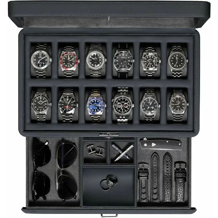 ROTHWELL’s Luxury Watch Box stands out with its key features: a real glass lid for visibility, PU leather for durability, and soft micro suede pillows to protect your watches. The oversized dividers and spacious compartments accommodate a wide range of watch sizes, while the drawer adds extra functionality for storing other valuables. This combination of beauty and utility sets it apart as an exceptional gift option.