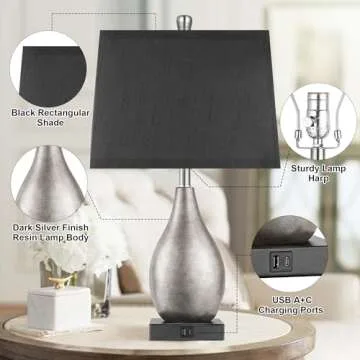 ROTTOGOON Table Lamps Set of 2 with USB A+C Ports, 22.5" Modern Bedside Lamps, 3-Color Temperature Classy NightstandLamp with Black Rectangular Shadefor Living Room, Bedroom(LED Bulbs Included)