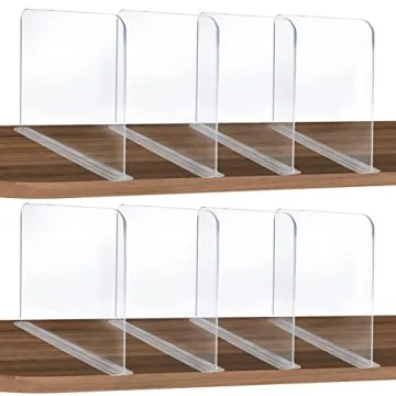 Show moreTransform your cluttered shelves into neatly organized spaces with the ROUFA 8Pcs Clear Acrylic Shelf Dividers. Designed to fit any thickness of shelves, these dividers are the perfect solution for maximizing your storage space without compromising on style. Made from high-quality acrylic, they offer a crystal-clear look that blends seamlessly with any decor, from modern to traditional. Their clipless design ensures easy installation on any shelf, making them a versatile choice for your bedroom, kitchen, office, or bathroom.