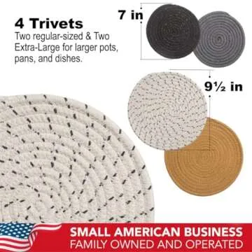Show more Introducing the stylish and functional kitchen decor that every home needs! Elevate your kitchen aesthetics with the rustic farmhouse-style trivets and placemats from Beets & Berry. These unique kitchen accessories not only serve a practical purpose but also add a touch of glam and mid-century modern sophistication to your dining experience. Handcrafted from 100% pure eco-cotton, each piece is designed to safeguard your countertops against heat damage from hot pots, pans, and dishes. The set includes a variety of sizes: two 7-inch and two 9-inch trivets, accompanied by four 13-inch diameter placemats which can double as trivets for larger dishes, ensuring versatility for every kitchenware situation.
