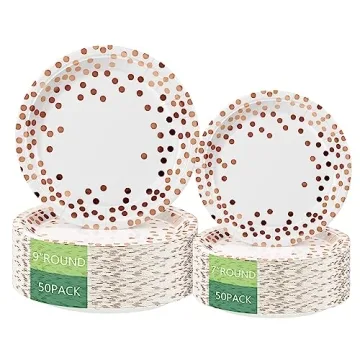 Elevate your celebrations with our **Round Disposable Paper Plates 100 Pack**, featuring a stunning **white and rose gold dot design** that infuses style and elegance into any gathering. These plates are the ideal combination of aesthetic appeal and robust functionality, ensuring you not only impress your guests but also facilitate a worry-free party experience. Each pack contains a generous total of **100 plates**: **50 dinner plates (9 inches)** and **50 dessert plates (7 inches)**, perfectly sized to cater...