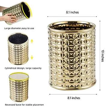 Round Golden Trash Can, Small Wastebasket, Garbage Receptacle Bin for Bathrooms, Powder Rooms, Kitchens, Home Offices - Durable Ceramics
