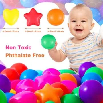 Show more Introducing a delightful set of colorful balls that make playtime a joy for children! Our 100 pieces of vibrant plastic ball pool balls are designed with kids in mind, featuring an assortment of playful shapes: 30 star-shaped, 30 heart-shaped, and 40 classic round balls. With a diameter of 2.17 inches (5.5 cm), these balls are the perfect size for tiny hands to grasp and toss, encouraging active play and exercise.