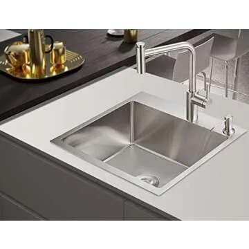 Show moreIntroducing the ROVOGO 21.7x17.7x8.7 in. Kitchen Sink, a masterclass in blend of elegance, functionality, and durability. Constructed meticulously from premium 304 stainless steel, this handmade masterpiece features an 11Gauge sink lip and an 18Gauge basin, ensuring unmatched strength and resilience to withstand daily wear and tear. Experience the tranquility of a sound-proof kitchen with ROVOGO’s innovative sound-dampening design, which incorporates a proprietary sound-absorption undercoating and rubber pads to minimize water drumming sounds and vibrations, thus creating a serene atmosphere while you cook. Measuring 21.7 inches in length and 17.7 inches in width, with an impressive depth of 8.7 inches, this sink is tailored perfectly for both lavish meal preparations and everyday chores. Its sleek brushed finish not only adds a refined aesthetic but also makes it incredibly easy to maintain and clean.