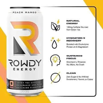 Rowdy Energy Drink, Peach Mango, Sugar Free - Natural Caffeine, Electrolytes | Hydration, Workout Performance, Focus, Recovery | B Vitamins and Keto-Friendly, 16 Fl Oz (12 Pack)