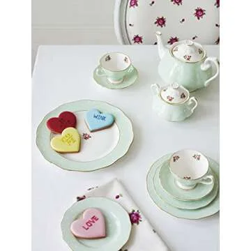 The soft mint green color of the set adds a touch of freshness and whimsy, distinguishing it from classic designs and making it a delightful centerpiece on your table. The elegant gold banding accentuates the delicate craftsmanship, providing that perfect touch of sophistication for any occasion. Packaged in a stunning Royal Albert presentation box, this tea set makes for an unforgettable gift. Whether you’re serving guests or enjoying a quiet moment of tea, the Polka Rose set is sure to impress with its exceptional quality and artful elegance.