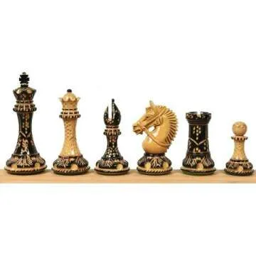 The American Staunton Chess Set includes 34 pieces, two of which are additional queens, weighing a total of 3.3 pounds. Each king stands proudly at 4.2 inches tall with a base diameter of 1.8 inches. The recommended chessboard square size for this set is between 2.16 to 2.36 inches. Please note that the chessboard is not included in the purchase, as this set consists solely of the beautifully crafted chess pieces. The use of solid charred boxwood, lacquered for a long-lasting gloss sheen, guarantees that each piece is not only visually stunning but also highly durable.