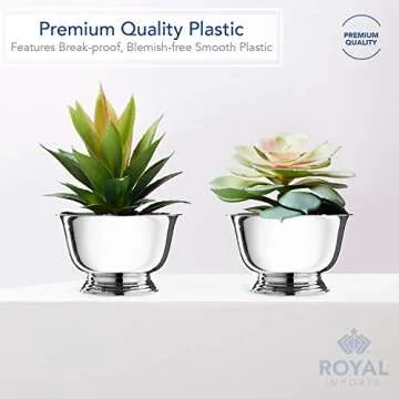 Show moreIntroducing the Royal Imports 6" Decorative Plastic Planter Pedestal Bowl, an essential addition to your home and event decor. Crafted with premium hard plastic, this beautifully designed pedestal bowl is not only elegant with its timeless round shape but also functional, ensuring it won’t break or bend out of shape when used outdoors. The durable material is engineered to resist fading and discoloration from the elements, offering longevity for all your decorative needs. Perfect for various applications, this versatile bowl can seamlessly transform into a planter, succulent terrarium, serving dish, snack tray, or even a chic vase. Add a touch of sophistication to your decor with this stunning, silver-footed home staple, available in a convenient 2-pack.