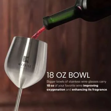 Show more Indulge in luxury with our elegant Stainless Steel Wine Glasses, perfect for those who appreciate and exhibit a taste of royalty. Crafted from premium quality stainless steel, these glasses boast a stunning design that not only elevates your dining experience but also ensures durability. With an impressive height of 8.3 inches and a width of 3.7 inches, these glasses can hold up to 18 ounces of your favorite wine, enhancing its fragrance and improving oxygenation for a refined drinking experience.