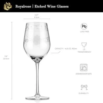 Royalrose Delight Glasses: Vintage Etched Wine Set of 4, 16.5oz, Dishwasher Safe