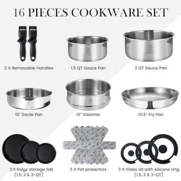 ROYDX 3-Ply Pots and Pans Set,18/10 Stainless Steel Cookware Set with Detachable Handles,PFOA Free, Frying Pan,Saucepans with Lid for All Stoves, Dishwasher and Oven Safe, Camping