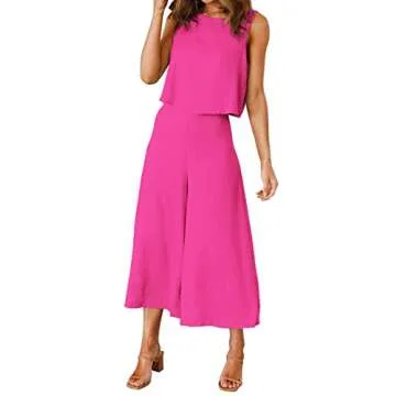 ROYLAMP Women's Summer 2 Piece Outfits Round Neck Crop Basic Top Cropped Wide Leg Pants Set Jumpsuits Rose Red XS