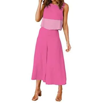 Show moreStep out in style with the ROYLAMP Women's Summer 2 Piece Outfits. This elegant ensemble features a chic round neck crop top paired with trendy cropped wide-leg pants, making it an essential addition to your summer wardrobe. Made from 100% polyester, this outfit is both soft and lightweight, providing you with a cool and breathable wearing experience all day long. The flowy material ensures maximum comfort as you enjoy the warm sunshine, making it perfect for any summer occasion.