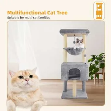 Constructed from high-quality materials, this cat tree features durable natural jute posts designed for long-lasting scratching. The included condo offers a cozy hideaway, while the hammock soothingly cradles your pets for optimal relaxation. Meanwhile, the top platform serves as a lookout point, giving your pets the royal treatment they deserve. Whether they're playing, scratching, or just enjoying a lazy afternoon, this cat tree meets all their needs.