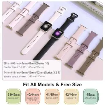 Show more Upgrade your Apple Watch experience with the RQQ 6 Pack Liquid Silicone Sport Bands, an essential accessory designed to blend style, functionality, and comfort. Perfectly compatible with a variety of Apple Watch models including the series 1 through 10 and Ultra, this collection offers unmatched versatility. Made from premium grade soft liquid silicone, these bands provide a skin-friendly, non-odor surface that ensures long-lasting comfort, making them ideal for all-day wear whether you're working, traveling, or enjoying outdoor activities.