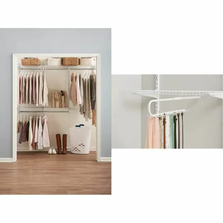 Designed also to include over 30 hooks for ties, belts, and scarves, the Rubbermaid Configurations Closet Organizers come with smooth glide pullouts that ensure easy access to your items. The white finish adds a clean, elegant look to match any decor. This kit is perfect for transforming any cluttered closet into an organized haven.