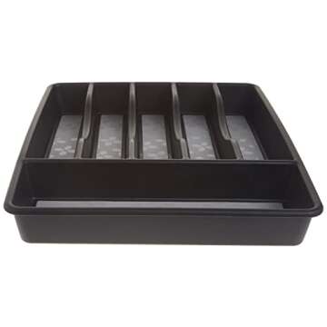 Show moreIntroducing the ultimate solution for maintaining an organized kitchen drawer - the Rubbermaid Silverware Organizer! This thoughtfully designed organizer features five spacious compartments and two expandable trays that effortlessly accommodate all your flatware and serving utensils. Made from high-quality, durable plastic, this sophisticated silverware tray offers both a high-class look and functionality that will impress any home cook. The no-slip base and feet ensure that the tray remains securely in place, even as you pull your drawer open and closed, guaranteeing that your utensils stay neatly organized at all times.