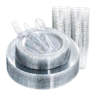 Rubtlamp 180PCS Glitter Plates Set with Silver Cutlery for Parties