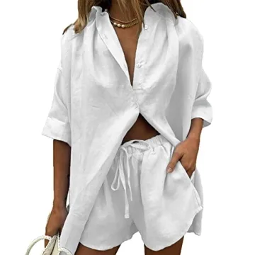 Show more Introducing the **RUEWEY Women 2 Piece Tracksuit Casual Outfits**, where comfort meets chic! This versatile ensemble features a stylish button-down shirt with a collar and long sleeves, perfectly paired with high-elastic waist lounge shorts. Made from a blend of soft cotton linen, this set ensures breathability and wear-resistance, making it an ideal choice for any casual setting. Whether you're lounging at home or stepping out for errands, this outfit offers a flattering loose fit that accommodates all body shapes. Available in a clean and classic Q-White, it’s a must-have for your summer wardrobe!
