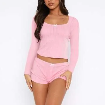RUEWEY Womens Lace Trim Ribbed Knit Pajama Sets Long Sleeve Top and Shorts Matching 2 Piece Lounge Set PJ Set Outfits (Y-Pink, S)