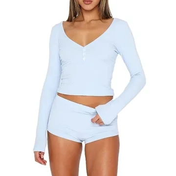 Show moreTransform your nighttime routine into a stylish retreat with the RUEWEY Womens Ribbed Knit Pajama Set. This luxurious two-piece lounge set is the perfect blend of comfort and chic design, tailored for the modern woman. Made from an ultra-soft, stretchy, and breathable ribbed knit fabric, this pajama set is not only functional but also fashionable, ensuring you look fabulous while you unwind. Designed with a long sleeve crop top and slim fit mini shorts, this set ensures you can lounge with confidence. The lightweight material offers just the right amount of warmth, making it ideal for cozy nights in.