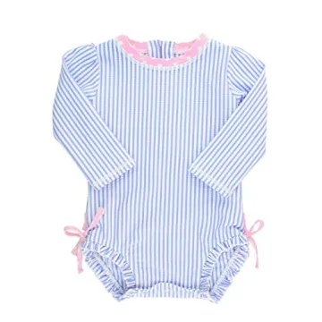 RuffleButts® Baby/Toddler Girls Long Sleeve One Piece Swimsuit - Blue Seersucker with UPF 50+ Sun Protection - 12-18m