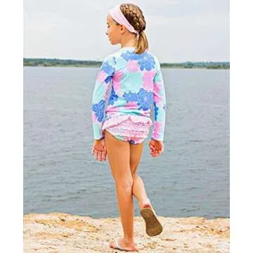 The RuffleButts® Girls Pastel Floral Long Sleeve UPF 50+ Rash Guard Bikini Swimsuit is available in various sizes including 2T, ensuring a perfect fit for your little one.