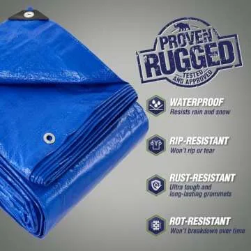 Show more Discover the ultimate solution for all your weather-related needs with the Rugged Rhino tarp. Designed to withstand the elements, this versatile tarp is waterproof, windproof, and UV resistant, ensuring durability and protection in any climate. Constructed with temperature resistance ranging from 0 to 120 degrees Fahrenheit, it's your go-to option for both hot summers and chilly winters. Whether you're covering a vehicle or shielding outdoor equipment, this tarp is up to the challenge.