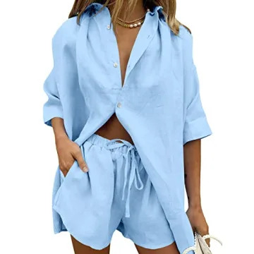 Show moreIntroducing the remarkable Runcati Womens Linen Cotton 2 Piece Outfits, designed for the modern woman who values style and comfort without compromise. This stunning set features a classic button-down, half-sleeve shirt paired with high waist drawstring shorts, making it the perfect ensemble for a variety of occasions. Crafted from a breathable and lightweight cotton-linen blend, this outfit promises to keep you cool and comfortable during those warm spring and summer days. The solid blue color offers versatility, effortlessly pairing with your existing wardrobe while ensuring you stand out beautifully.