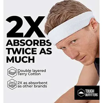 Show more Introducing the ultimate solution for anyone seeking to keep sweat at bay during intense workouts or outdoor activities! Our head sweatband redefines comfort and functionality with its unmatched absorption capabilities, thanks to its two-layer Terry Cotton construction that absorbs moisture far better than the competition. Say goodbye to uncomfortable drips or distracting sweat rolling down your face, as this headband helps you maintain your focus on what matters most: achieving your fitness goals.