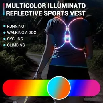 Show more The SUPER BRIGHT MULTICOLOR ILLUMINATED VEST is a revolutionary running accessory designed for safety and visibility. This reflective vest comes equipped with an impressive array of 7 colored light modes and 4 customizable options. The 360° lighting technology ensures that you are visible from over a quarter mile away, allowing you to confidently jog at night or in low light conditions. The vest's vibrant LEDs not only brighten your path but also alert distracted drivers well before they catch sight of you.