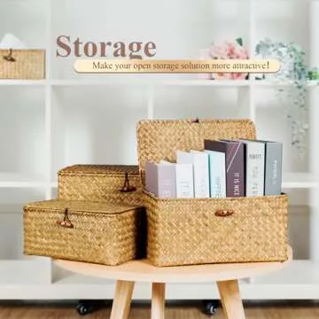 Ruosuruosu Decorative Wicker Storage Bins with Lids,Woven Seagrass Storage Baskets for Kids Toys,Shelves, Bathroom, Bedroom,Set of 3 Stackable Storage Boxes Large, Medium, Small
