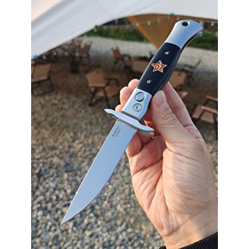 Show more Introducing the Russian Finka-NKVD KGB Folding Pocket Knife, a masterfully crafted utility tool that embodies functionality and aesthetic appeal. Measuring an impressive total length of 8.66 inches, this knife features a razor-sharp 3.74-inch mirror polished blade made from X12M steel, renowned for its exceptional edge retention. Its handle is a unique combination of lightweight aviation aluminum inlaid with resin, providing not only a solid grip but also a striking look that pays homage to Soviet history with the iconic star design. The knife also comes with a beautifully designed leather sheath, ensuring safe storage and portability.