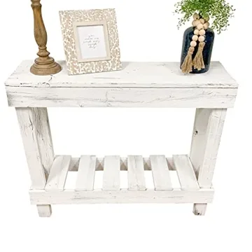 Show moreIntroducing the Rustic Barnwood Entry Sofa Table by Del Hutson Designs, a stunning addition to your home decor! Handcrafted with care using 100% reclaimed wood, this entryway table showcases a unique rustic charm that blends effortlessly into any interior style. With its beautiful white finish complemented by natural wood grains of grey and brown, it effortlessly enhances your space while providing practical functionality. The table is completely assembled upon arrival, saving you time and allowing you to enjoy your purchase right away.