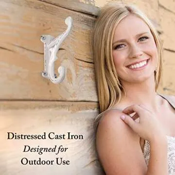 Rustic Cast Iron Coat Hooks (3 Pack) Wall Mounted Farmhouse Decorative Wall Hooks, Vintage Hooks for Hanging Coats, Bags, Hats, Towels (Rustic Antique White Patina, Includes Hardware)