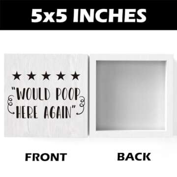 Show moreTransform your bathroom into a delightful retreat with the Rustic Funny Farmhouse Bathroom Toilet Decor Would Poop Here Again Wood Sign. Measuring at a compact size of 5 x 5 inches, this charming wooden sign is perfect for adding a touch of humor and rustic elegance to any restroom. Crafted from real wood, it effortlessly combines functionality with style, making it a must-have accessory for guest bathrooms, restrooms, or even a quirky décor piece for your own bathroom sanctuary. It is sure to spark laughter and brighten the day of anyone who visits!