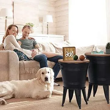 RUSTOWN Farmhouse Accent Side Table, Rustic Antique Galvanized End Coffee or Cocktail Table, Storage Metal Bin with Round Wood Lid Set of 2 (Black)