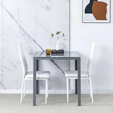 Elevate your dining experience with the **RVEE 3 Pieces Grey Dining Table with White PU Leather Chairs Set**. This chic dining set combines modern aesthetics and functional design, making it an ideal addition to any kitchen or dining space. The sleek **square table**, crafted from high-quality 8mm tempered glass, boasts a sturdy **metal frame** that ensures both durability and elegance, accommodating up to **80 lbs**. Paired with two stylish **faux leather chairs**, the set is perfect for cozy family dinners...