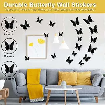 Ryangic 3D Butterfly Wall Decor 48pcs Black Polished Butterflies Wall Stickers 3 Sizes Durable Butterfly Wall Decals DIY Wall Art for Bedroom Living Room Halloween Decoration Party Indoor (Black)