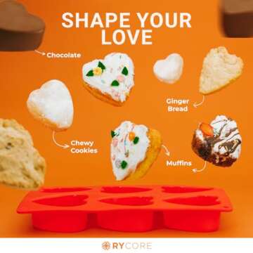 Show moreUnleash the Baker in You! With the Rycore Heart Silicone Molds for Baking, transform your baking experiences into a delightful journey of creativity. Perfectly crafted for producing mini heart-shaped cakes, cookies, chocolates, and more, these molds make baking fun and effortless. They come in a vibrant red color that adds a charming touch to your kitchen. Each mold consists of six large cavities that hold 4 ounces each, measuring a compact 3 inches—ideal for individual servings that evoke love and joy.