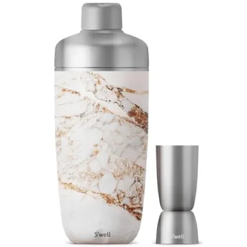 Show more Meet the stunning S’well Stainless Steel Shaker Set with Jigger in the exquisite Calacatta Gold finish, designed for both style and functionality. This 18oz shaker is not just a barware essential but a statement piece that elevates your cocktail-making experience. With its triple-layered vacuum insulation technology, your drinks stay colder longer, allowing you to enjoy perfectly chilled cocktails without the worry of condensation forming on the surface. The sleek and beautifully crafted design ensures that this shaker not only performs excellently but also looks luxurious on your bar countertop.