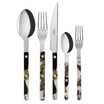 Show moreIndulge in a luxurious dining experience with our exquisite five-piece cutlery set, designed for those who appreciate both style and functionality. Crafted with precision, this set includes a soup spoon, dinner knife, dinner fork, salad fork, and tea spoon, catering to every course of your meal. The elegant tortoiseshell-style handles, made from high-quality resin, provide a stunning visual appeal, while the stainless steel 18/10 ends ensure durability and a refined finish. Imported directly from France, this cutlery set not only enhances your dining table but also becomes a statement piece for entertaining guests.