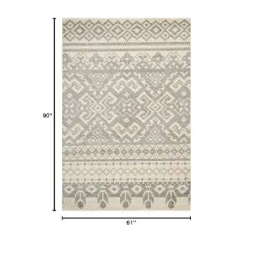 Show more Introducing the SAFAVIEH Adirondack Collection Area Rug, your new go-to choice for style and substance in home décor. Measuring 5'1" x 7'6", this stunning rug features an elegant ivory and silver color palette that beautifully complements any room’s aesthetic. The rustic boho design introduces a complex, geometric pattern that adds sophistication while remaining understated, making it the perfect addition for both modern and traditional interiors. Crafted from enhanced synthetic fibers, this rug is remarkably durable, ensuring it withstands the test of time without compromising style.