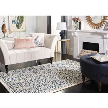 Show more Transform your living space with the exquisite SAFAVIEH Cambridge Collection Area Rug, a stunning addition that merges both elegance and comfort. This handmade Moroccan wool rug, available in a generous size of 8' x 10', features a vibrant navy blue and ivory color palette that enhances any room's aesthetic. Crafted with meticulous attention to detail, this rug is not just a decorative piece; it is designed to withstand the rigors of high traffic while providing a plush underfoot experience.